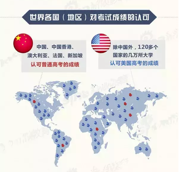 目前就中國的普通高考與美國高考相比,4個國家認可普通高考成績,學生的認可度稍顯弱并對之后的留學目的國選擇有所限制;相反,120多個國家的幾萬所大學認可美國高考的成績,可見,擁有美國高考成績的學生猶如有一張國家“通行證”。