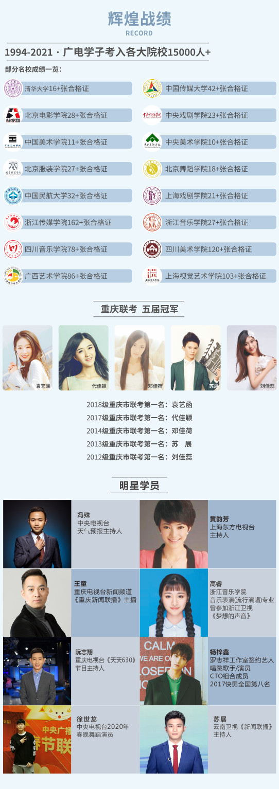 主要開展播音主持、表演、音樂、舞蹈、編導(dǎo)、攝影等高考培訓(xùn)課程,行課期間在校內(nèi)上課,寒暑假及高考集訓(xùn)在重慶主城本部上課,80%以上的專業(yè)過關(guān)率。