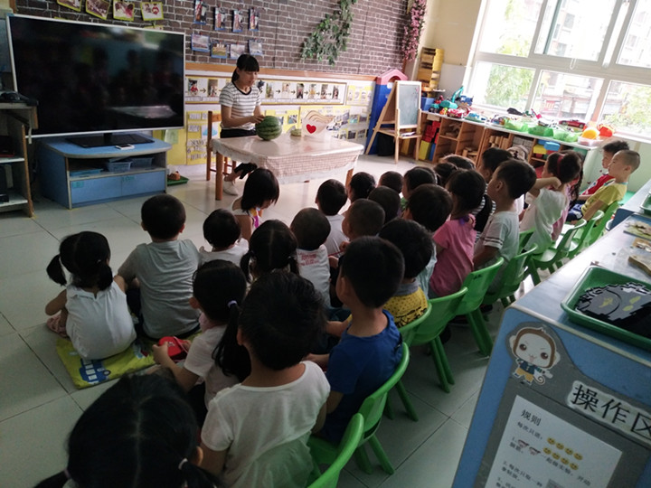 今天飯后吃的是大西瓜,看到西瓜,孩子們象往常一樣興奮。引導(dǎo)幼兒觀察西瓜的外部特征:“西瓜是什么形狀的?什么顏色的?(幼兒自由觀察、講述)