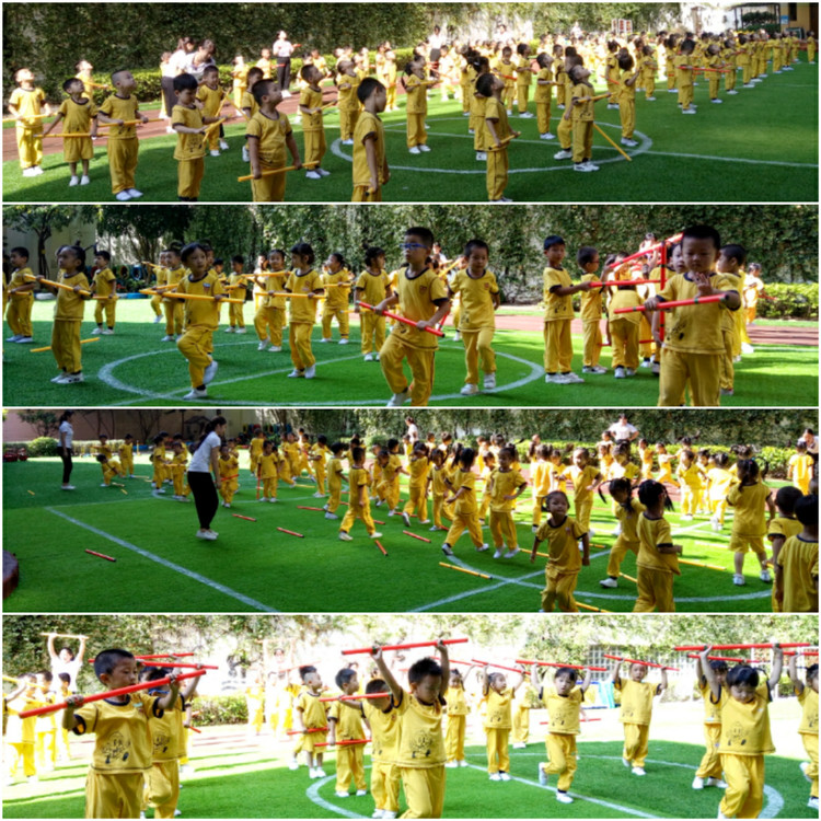 鮮明的主題,富有創(chuàng)意,別出心裁的編排,首先上場的是中班的小朋友,他們手拿“金箍棒”,為我們帶來了一場精彩的模仿操!為了激發(fā)小朋友的早操興趣,教師們巧妙的將金箍棒作為早操器械。 “山中無虎猴稱王,中班絕對(duì)最最強(qiáng)” 看!山中無老虎猴稱王了!