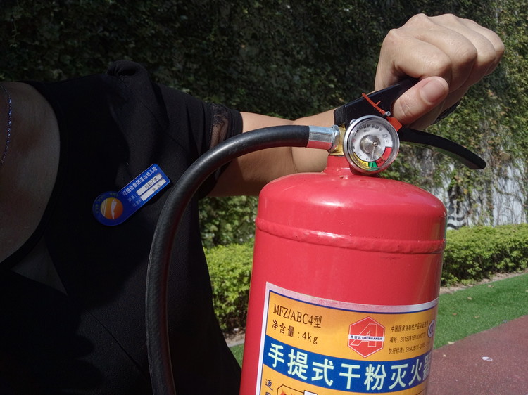 在距火焰兩米的地方,右手用力壓下壓把,左手拿著噴管左右搖擺,噴射干粉覆蓋燃燒區(qū),直至把火全部撲滅。