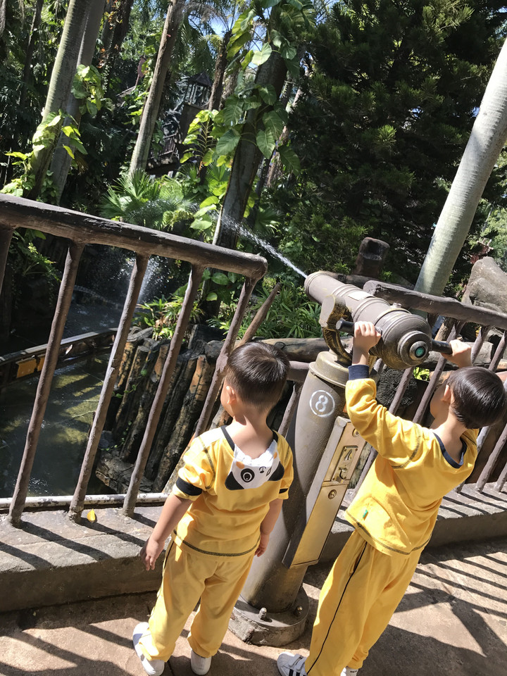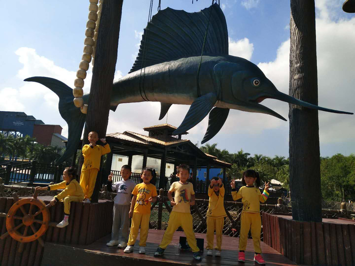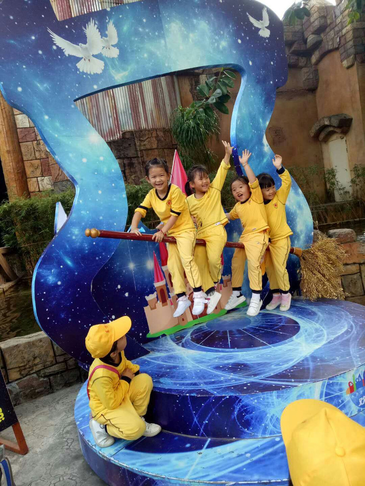 我們從主題園區(qū):西班牙廣場、魔幻城堡、冒險山、金礦鎮(zhèn)、香格里拉雪域、陽光海岸、颶風灣、歡樂時光。接著來到《幻城》、3D影院、四維電影。每個幼兒臉上充滿了好奇,他們的心情是全然不同的,看著孩子們一張張?zhí)煺娴男δ?,此時我也被這種氛圍感染了!