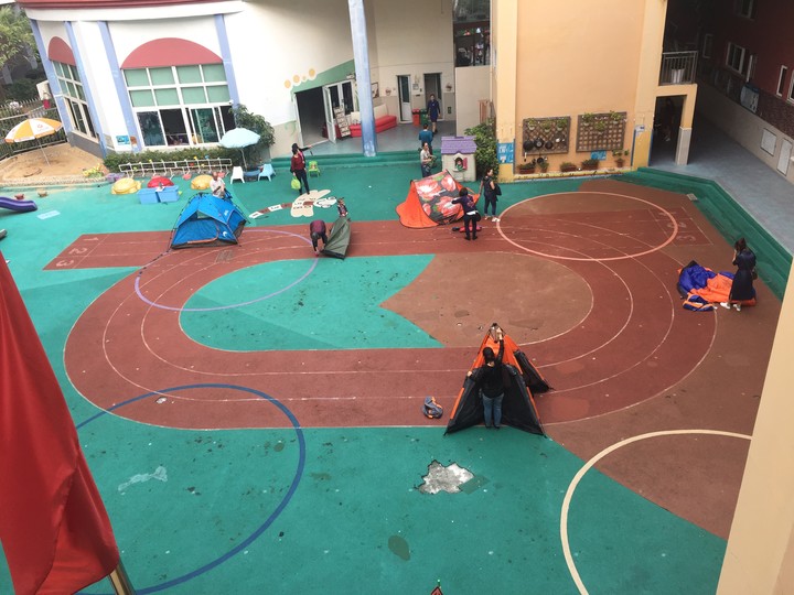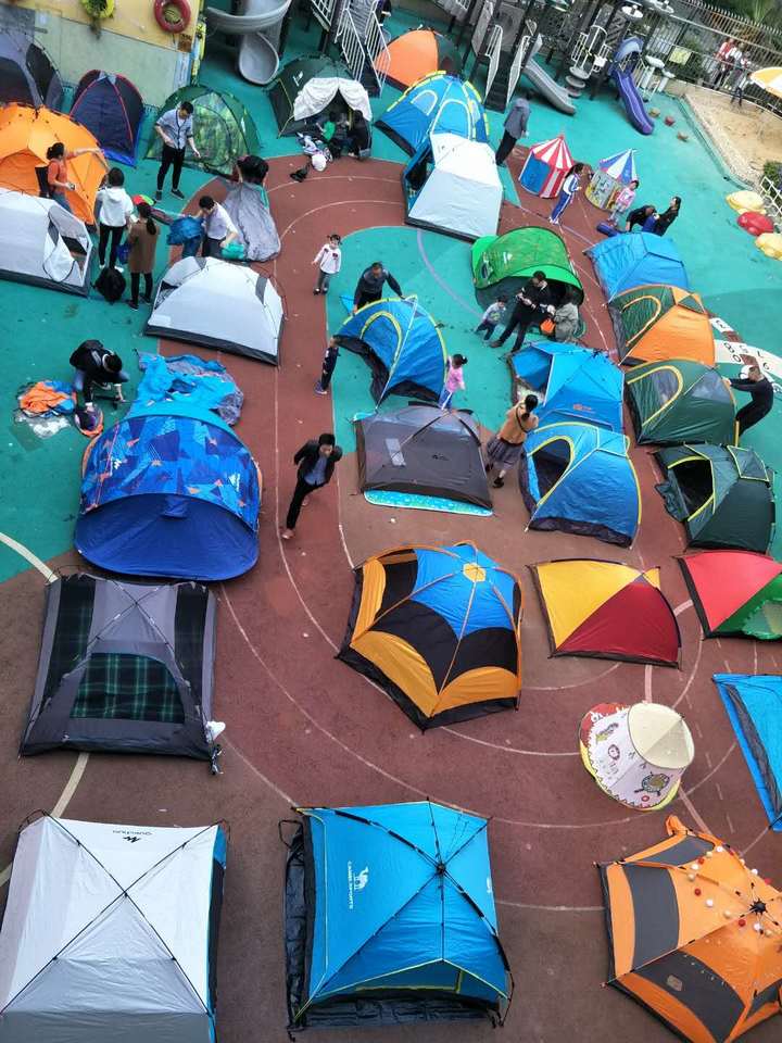下午4點(diǎn)00分左右,家長(zhǎng)們陸陸續(xù)續(xù)帶著自家的帳篷來到幼兒園,迫不及待地開始互相交談如何搭建,如何安置,他們更勝孩子般地期待著今晚親子閱讀的開始。