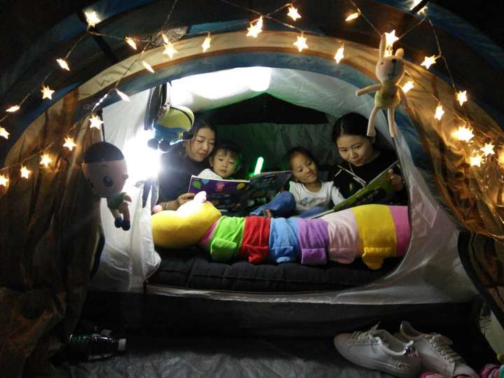 看,帳篷內(nèi)一雙雙沉浸在故事中的小眼神,專注、認(rèn)真,相信是感受到了閱讀的魅力。