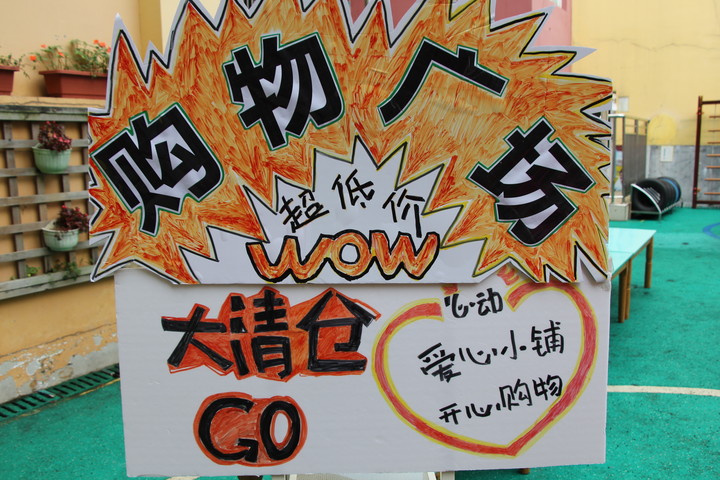 在義賣現(xiàn)場,大家都精心設(shè)計了漂亮的招牌、宣傳廣告,豐富多彩的廣告標(biāo)語為今天的義賣增添了不色彩。看我們的小朋友們,坐在自己班的攤位前,家長們也在一旁協(xié)助著,想出各色各樣的口號來吸引其他小顧客們的注意。孩子們紛紛扮演起小“老板”的角色,熱情的向往來的小“顧客”推銷自己的商品。