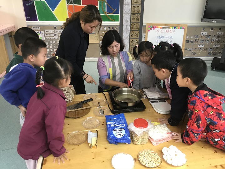 “哦,原來(lái)我們吃的牛軋?zhí)鞘沁@樣做成的呀”,通過(guò)觀察與親身體驗(yàn),了解一樣食物的制作過(guò)程,這樣的學(xué)習(xí)是不是很有趣呢?