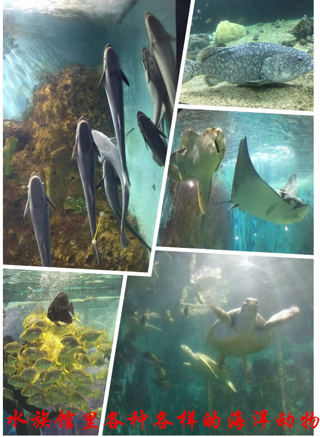 到達(dá)目的地后導(dǎo)游哥哥把我們先領(lǐng)進(jìn)了水族館,一進(jìn)去孩子們看到成群的海洋動物都在歡呼尖叫著,“看,那里有海龜海龜...大沙魚...飛魚...海星...”我們也跟著孩子們童心大發(fā),好像又回到了孩童時代,歡樂無比,快樂無限。