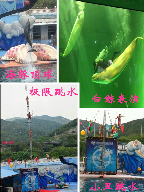 吃過午飯之后就是自由活動時間,我們就去看了各種各樣的表演:白鯨表演、海底萬魚爭食表演、極限高空跳水表演、異國小丑跳水表演、海豹、海獅、海豚的表演...孩子們和家長們都看得津津有味,要退場了孩子們還依依不舍,留連忘返。