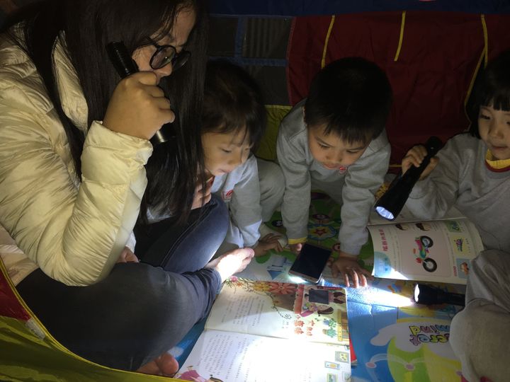 故事劇場結(jié)束后,換書大會接著就開始了!這邊用一排排的小板凳用彩燈圈起來,就像一只只螢火蟲圍繞著。在板凳上面放著孩子們提供作為交換的好書。小朋友在家長的帶領(lǐng)下一手拿著換書券,一手拿著手電筒穿梭在一排排的書本中,孩子們在家長的來領(lǐng)下認(rèn)真地翻閱著,都希望能夠找到心儀的書。孩子們兌換到圖書后,和家長一起進(jìn)行“帳篷夜讀”,顧名思義就是走進(jìn)帳篷,手持手電筒閱讀換到的圖書。哇!真是太有意思了!這給孩子創(chuàng)造不一樣的閱讀氛圍,也讓幼兒收獲不一樣的閱讀樂趣。