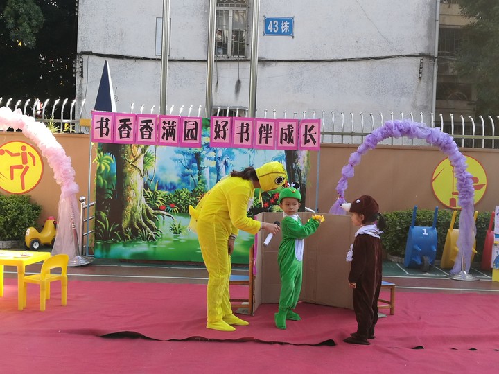 2016年11月28日,在遠(yuǎn)恒佳花園幼兒園大操場,中三班的小朋友和他們的爸爸媽媽為大家獻(xiàn)上了親子童話劇《弗洛格找寶藏》。弗洛格和小熊去挖寶藏,他們先挖了個洞,洞越挖越深,結(jié)果被困在里面了。小熊急哭了,弗洛格想出了一個唱歌的辦法來安慰小熊。直到第二天,鴨子出來散步時,才發(fā)現(xiàn)了他們。最后鴨子去找老鼠幫忙,老鼠很聰明,搬來了一架梯子,救出了弗洛格和小熊。