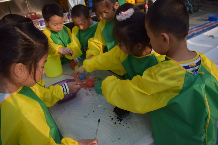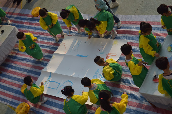 在活動(dòng)中果果老師首先引導(dǎo)孩子用不同的方式跟同伴打招呼,老師游刃有余地利用精確的語速和語調(diào)同時(shí)扮演故事中的兩種角色,還靈活運(yùn)用肢體語言和手偶等形式帶領(lǐng)孩子們走進(jìn)聽故事的世界,一本普通的《奧莉薇》繪本故事,孩子們都聽得津津有味,表現(xiàn)地異常安靜,都非常用心地聽老師講故事。接著,游戲“你演我猜”將小朋友帶入到了另一個(gè)高潮,請個(gè)別小朋友上去抽一張卡片,然后用肢體語言表演出來,下面的小朋友根據(jù)表演者做的動(dòng)作猜一猜是什么或是在做什么,現(xiàn)場的活動(dòng)氛圍非常好,小朋友都爭先恐后的舉手大聲回答,我們的孩子們表演能力非常強(qiáng),下面競猜的小朋友也非常聰明,一點(diǎn)都難不倒我們喲,一下子就猜出來了。最后,果果老師引導(dǎo)孩子通過討論“猜一猜奧莉薇的作品畫的是什么?是用什么畫出來的”,引出滴灑畫的作畫方法,老師通過提問激發(fā)孩子的創(chuàng)作欲望“你想不想畫畫,想畫什么呢?準(zhǔn)備用什么來畫呢?”,小朋友們的回答也是天馬行空、各式各樣,“我想畫大房子、大河、大城市、花園、西瓜”“我要用顏料來畫、用彩色筆畫、顏料+吸管吹畫、藍(lán)色畫藍(lán)天、彩色畫彩虹”等等。課后老師帶領(lǐng)小朋友來到了戶外進(jìn)行滴灑畫的創(chuàng)作,進(jìn)一步提升他們的藝術(shù)鑒賞力及想象力,小朋友揮舞著排筆蘸上自己喜歡的顏料開始揮灑作畫了,有的蘸顏料,有的在紙上使勁灑顏料,場面頓時(shí)熱鬧起來了,來來回回的總有人在走動(dòng)著,忙碌著,一開始看似很糟糕的場面到后來看到小朋友們無拘無束自由滴灑出來的作品,五顏六色,藝術(shù)性極高!