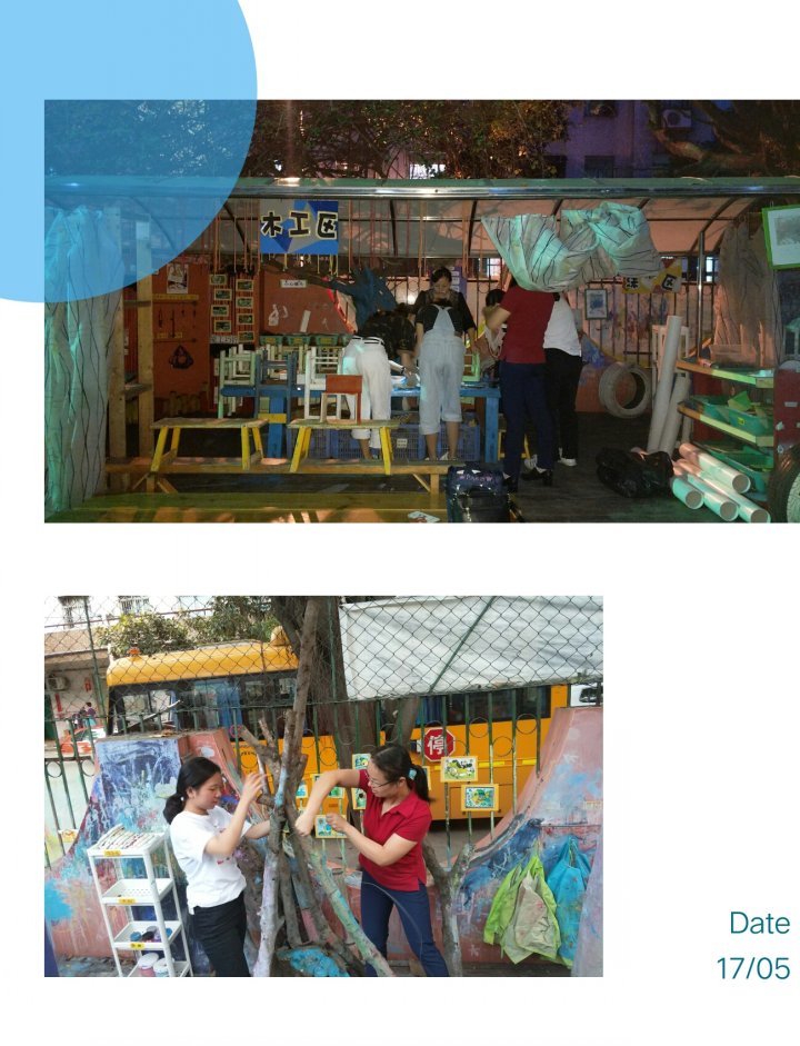 大班級組:承擔(dān)了木工區(qū)、玩水區(qū)、表演區(qū)的環(huán)境創(chuàng)設(shè)與材料的投放。木工區(qū)根據(jù)中大班幼兒的發(fā)展及年齡特點(diǎn),提供錘子、釘子、鉗子等工具讓幼兒進(jìn)行一些拆、裝、拼等活動,鍛煉幼兒的手部肌肉和精細(xì)動作的發(fā)展,并提供一些木工膠水、螺絲釘、護(hù)目鏡、手套和與木工相關(guān)的書籍。