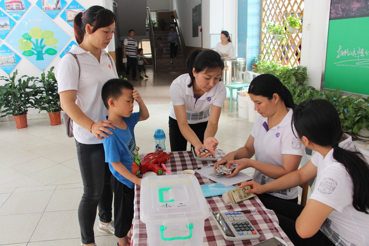 由家委和幼兒園財務(wù)一起清點各班義賣的善款并匯入紅十字會愛心賬戶。