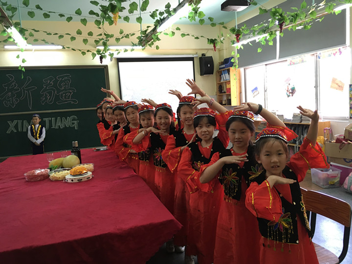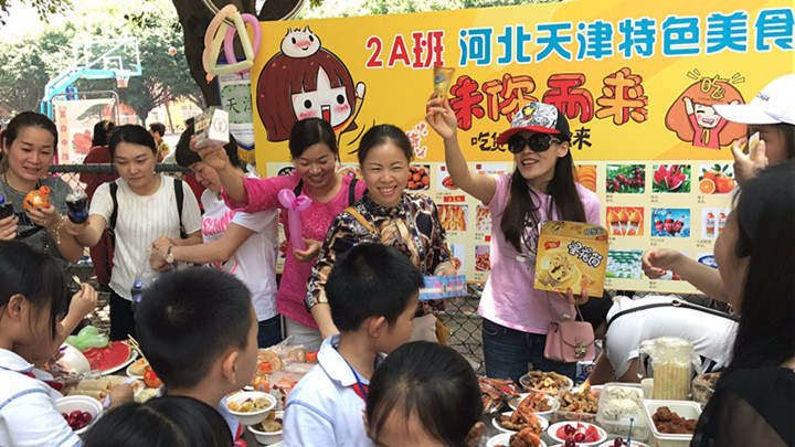 瞧!一年級小朋友攤位準備的是華南華中地區(qū)的特色美食:武漢熱干面、廣東各類粵菜,廣西梧州龜苓膏,江西清明果蒙古,湖南臭豆腐,河南大餅,還要澳門各類特色糕點小吃。二年級攤位的是華北東北地區(qū)的美食:老北京冰棍、蒙古烤全羊、奶制品等。三年級江浙地區(qū)的特色美食有:東坡肉、荷葉粉、黃山石雞等。四年級西北地區(qū)的涼皮、烤羊肉串、葡萄干等。五年級西南地區(qū)的云南米線、四川泡菜等。六年級香港臺灣地區(qū)各種點心……