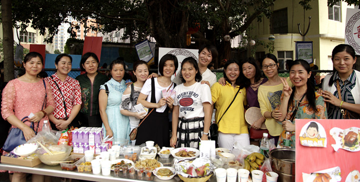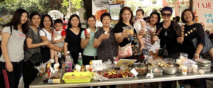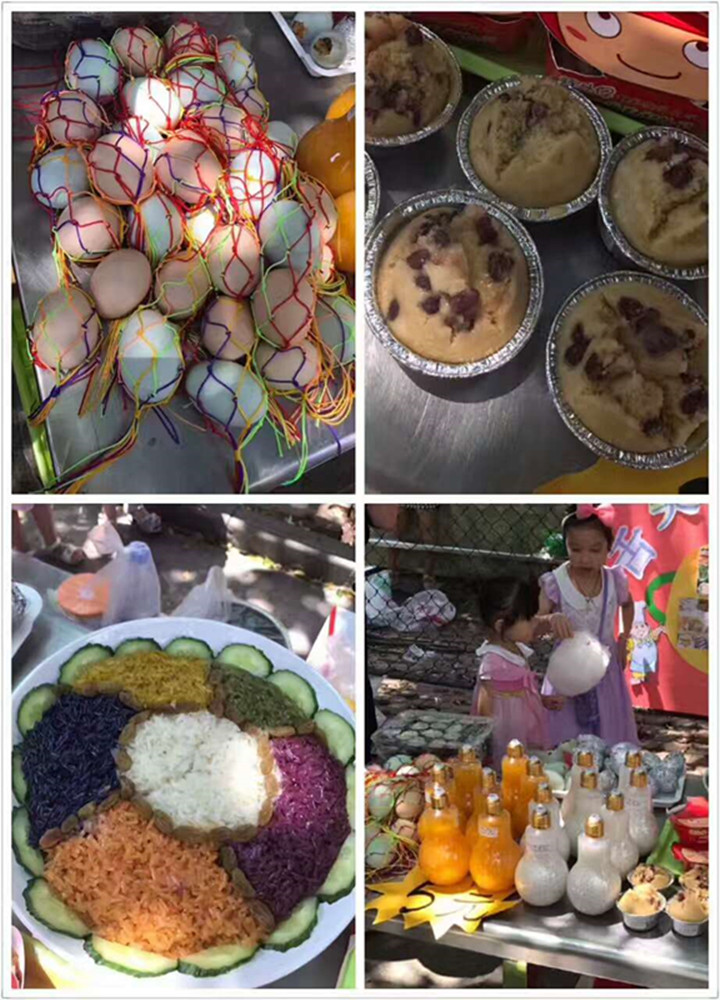 活動之初,每個班就已經(jīng)根據(jù)自己班級的特色,設(shè)計好了菜譜,等到今天烹飪好帶過來。中午1點鐘左右,各班家長義工帶著孩子們,紛紛端著自己精心制作,并代表班級“省份”的美食來到義賣區(qū)域。每個班級有固定的一個攤位,攤位后上方有寫著代表各自地方區(qū)域的旗幟,左右兩邊是各班自由設(shè)計的美食介紹、廣告語和圖片。孩子們、家長們先把食物分門別類,精心包裝好,又定好價錢,整理好自己的攤位,爭取以最好的面貌來迎接前來購買的小顧客們。