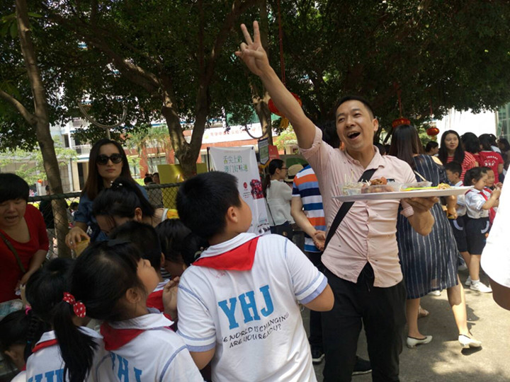 鏡頭移向操場,一場囊括神州大地各色美食的嘉年華活動,在龍華中英文實驗學校的操場上盛情上演。放眼望去,偌大的操場儼然成了一條“美食街”:人來人往,熙熙攘攘。叫賣聲,吆喝聲此起彼伏。各種美食琳瑯滿目,讓人垂涎欲滴。孩子們手握代金券,在這個攤位看看,到那個攤位瞧瞧,熱鬧非凡。