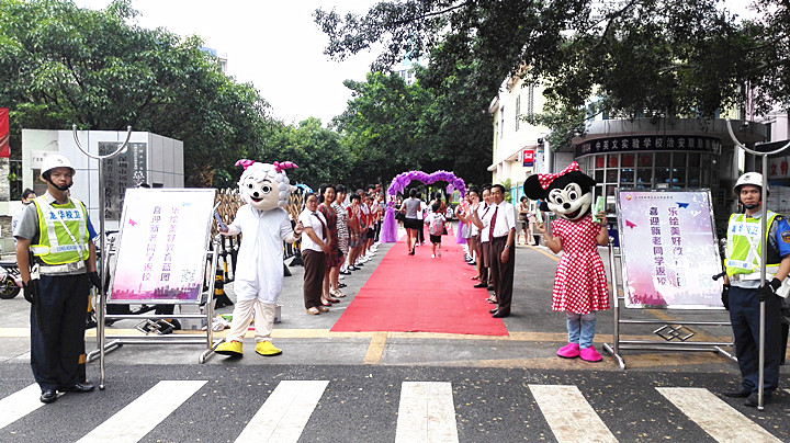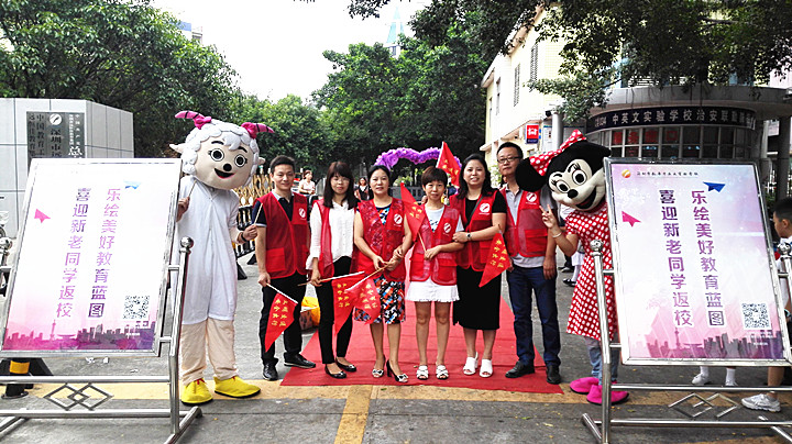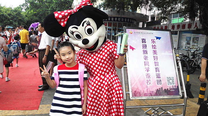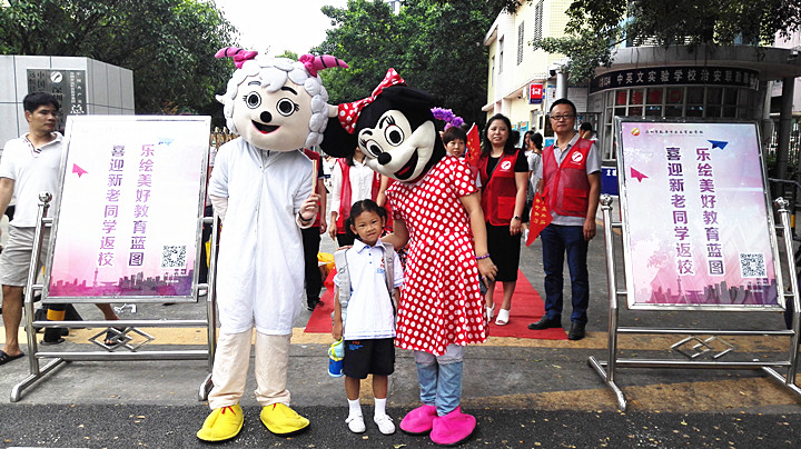 2017年9月1日晨,同學(xué)們?cè)缭绫成蠒?,邁著輕盈的腳步去上學(xué)。來到龍華中英文實(shí)驗(yàn)學(xué)校門口,咦!這么熱鬧,這么喜慶!原來是學(xué)校卜校長(zhǎng)帶領(lǐng)干部、師生、家長(zhǎng)代表一早就到學(xué)校大門口喜迎新老同學(xué)返校。還有美洋洋和Minnie為同學(xué)們贈(zèng)送鉛筆、尺子、文具盒等小禮物呢!