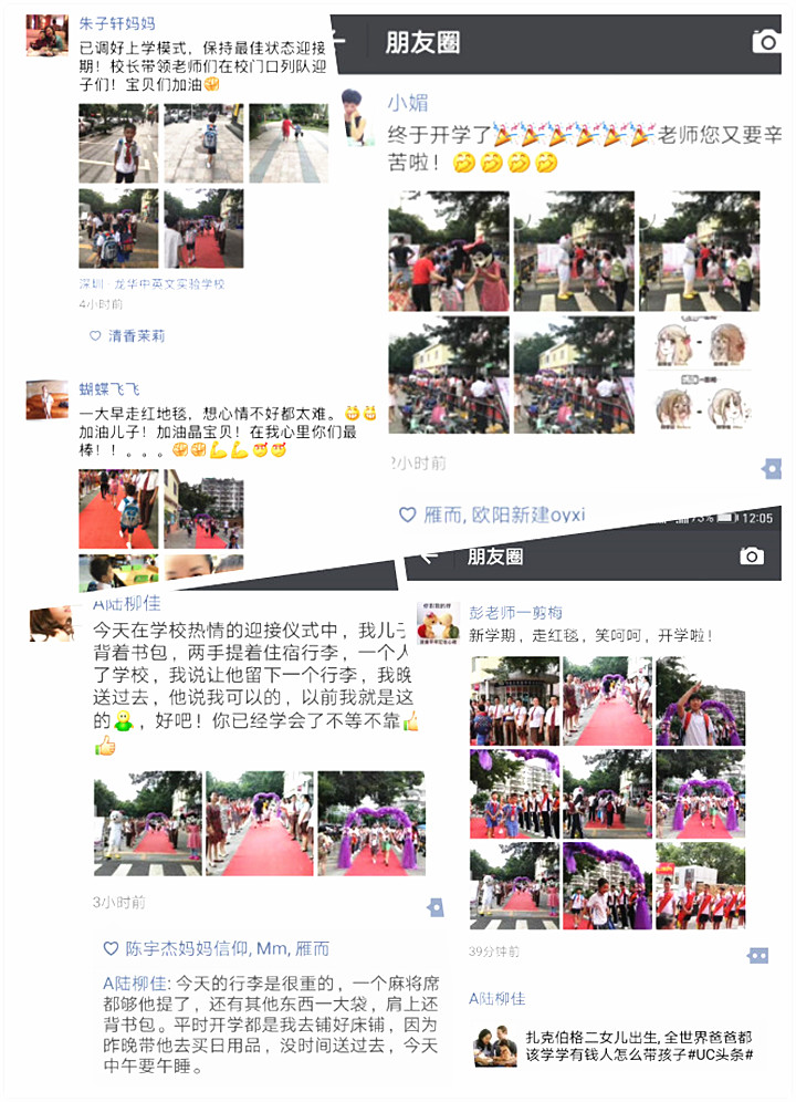 學(xué)校別具特色的入學(xué)歡迎禮,引來了第一天來校上班上學(xué)的師生、送孩子入學(xué)的家長(zhǎng)、甚至是路人的關(guān)注,大家紛紛圍觀拍照,發(fā)微信朋友圈,QQ相冊(cè)曬照片、視頻,記錄下這難忘的情景,曬出這美麗的一刻。大家紛紛稱贊龍華中英文開學(xué)第一天愛滿校園,為學(xué)生營造了一個(gè)多彩的學(xué)習(xí)生活環(huán)境,給了孩子們開學(xué)第一天美美的好心情,為新的學(xué)期、新的學(xué)年開了個(gè)好頭!