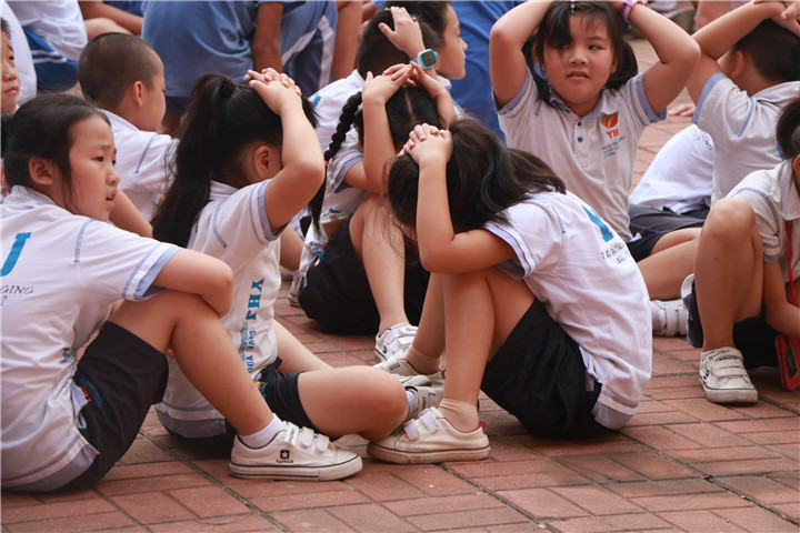 第一階段,演練過程中,當(dāng)學(xué)生們聽到“地震發(fā)生”的信號(hào),老師組織學(xué)生進(jìn)行避震,反映迅速,動(dòng)作標(biāo)準(zhǔn)。