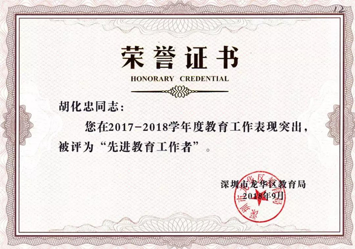 龍華區(qū)先進工作者獲得者:胡化忠副校長