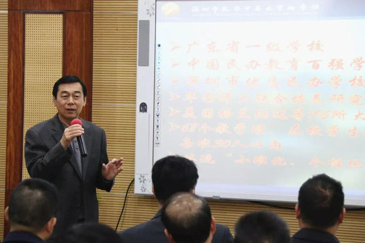 在學(xué)校教師培訓(xùn)中心,全國(guó)名校長(zhǎng)、特級(jí)教師、龍華中英文實(shí)驗(yàn)學(xué)校卜祥林校長(zhǎng)以《辦優(yōu)質(zhì)高端學(xué)校,育多元精英人才》為題,向領(lǐng)導(dǎo)嘉賓簡(jiǎn)要介紹了學(xué)校的辦學(xué)成果。卜校長(zhǎng)向來(lái)賓介紹了龍華中英文“2018年高考上線率達(dá)96.6%”,“2018春季全區(qū)質(zhì)量調(diào)研檢測(cè)小學(xué)、初中、高中七個(gè)參考年級(jí)總均分有六個(gè)年級(jí)列全區(qū)民辦學(xué)校第一名;其中八年級(jí)列全區(qū)公民辦學(xué)校第二名”,學(xué)?!皣?guó)際理解教育、藝體教育、創(chuàng)客教育”等特色或成果,學(xué)?!皟?yōu)化四大結(jié)構(gòu),深化五項(xiàng)改革”舉措等,表示龍華中英文實(shí)驗(yàn)學(xué)校正以集團(tuán)“美好教育”引領(lǐng),以全面提高教育教學(xué)質(zhì)量為核心,在龍華區(qū)乃至深圳市,都有著強(qiáng)大的核心競(jìng)爭(zhēng)力和品牌影響力。