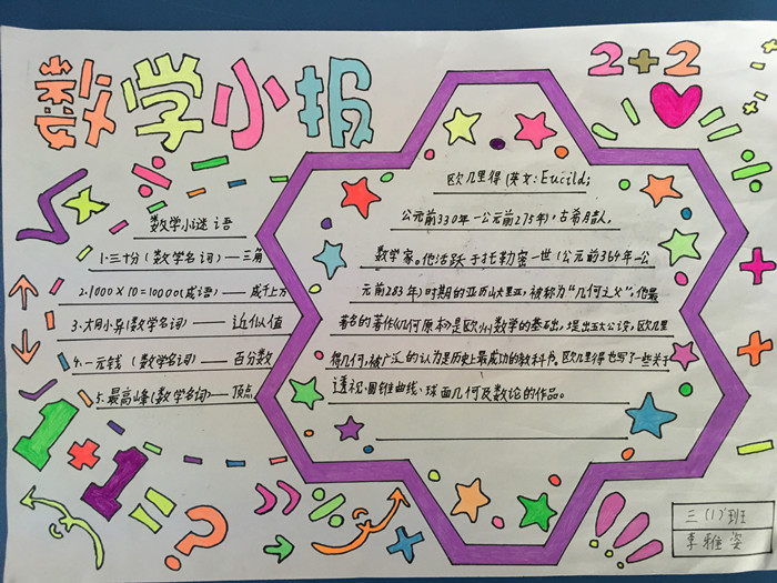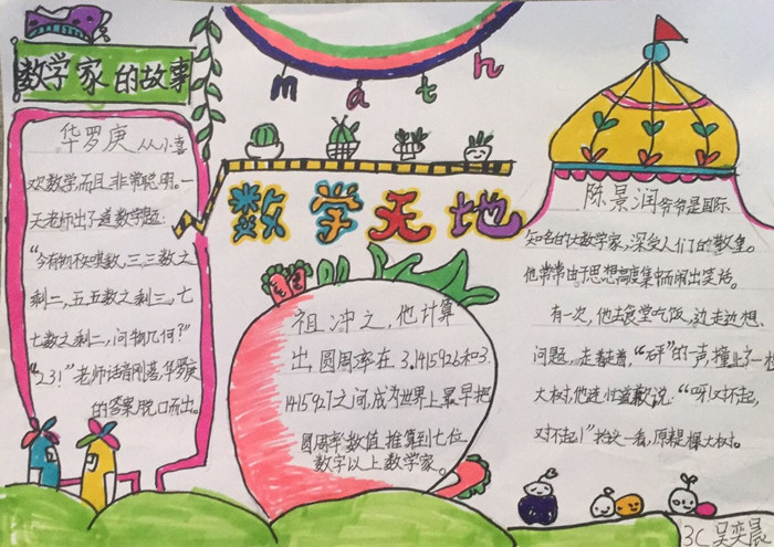 三年級(jí):數(shù)學(xué)手抄報(bào),通過(guò)了一張張精美的手抄報(bào)制作,讓我們走進(jìn)了數(shù)學(xué)家的故事,領(lǐng)略了數(shù)學(xué)名人的風(fēng)采,讓我們見(jiàn)識(shí)了數(shù)學(xué)名題、數(shù)學(xué)趣題,開(kāi)拓了數(shù)學(xué)思維,讓我們了解了數(shù)學(xué)日記,打開(kāi)了數(shù)學(xué)知識(shí)的大門(mén)。