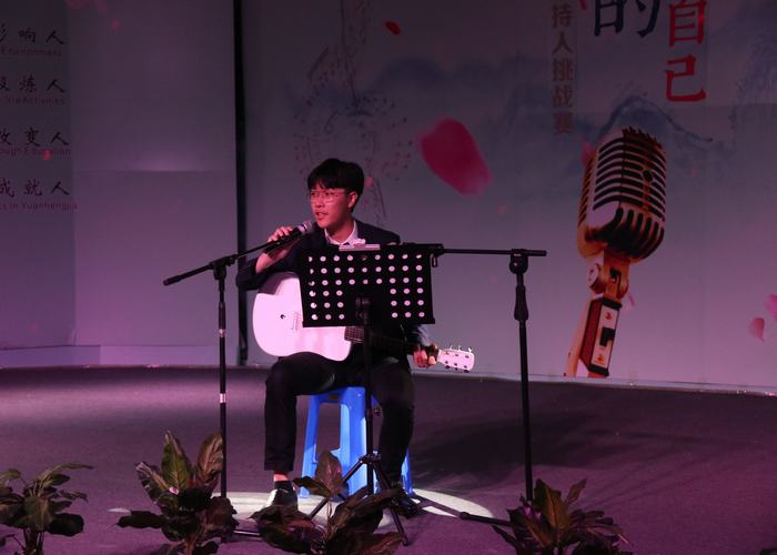 14號王超慧同學(xué)用一把吉自彈自唱一曲《成都》,觀眾的思緒隨著優(yōu)美的歌聲徜徉在成都街頭,眼前仿佛出現(xiàn)了一家極具鄉(xiāng)情鄉(xiāng)韻的小酒館。