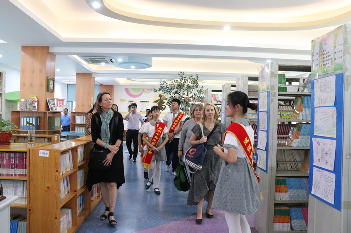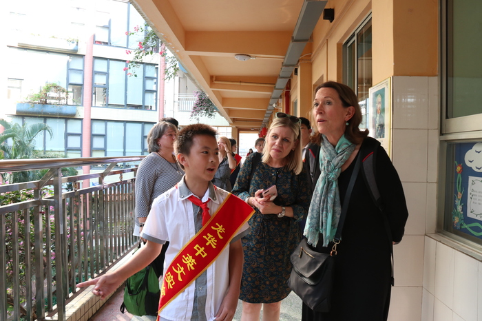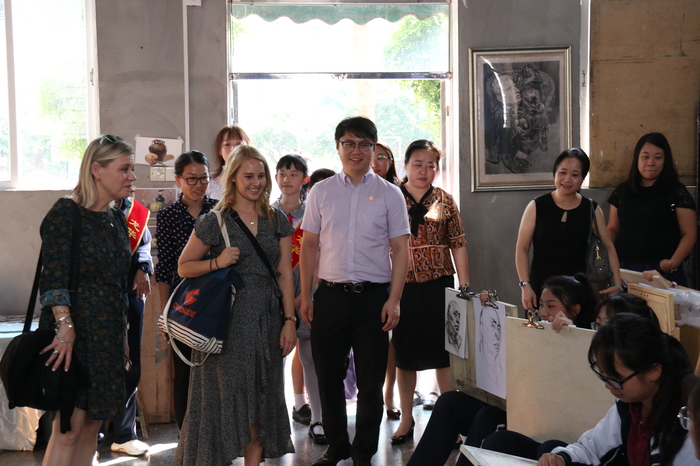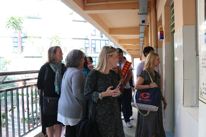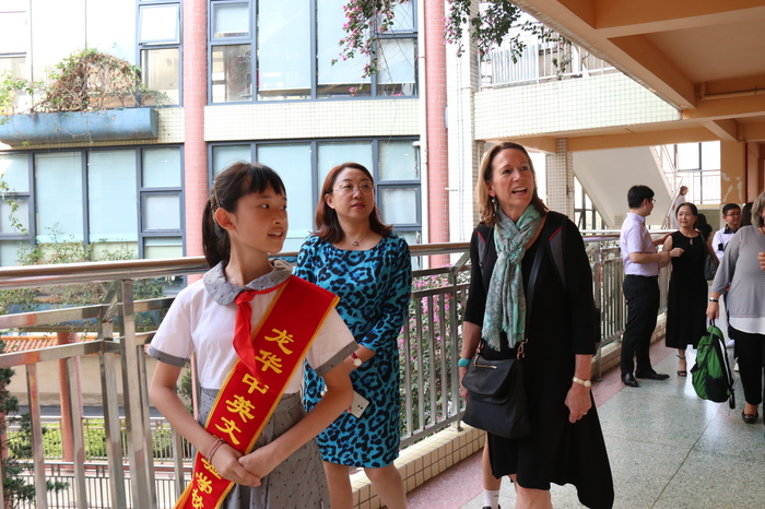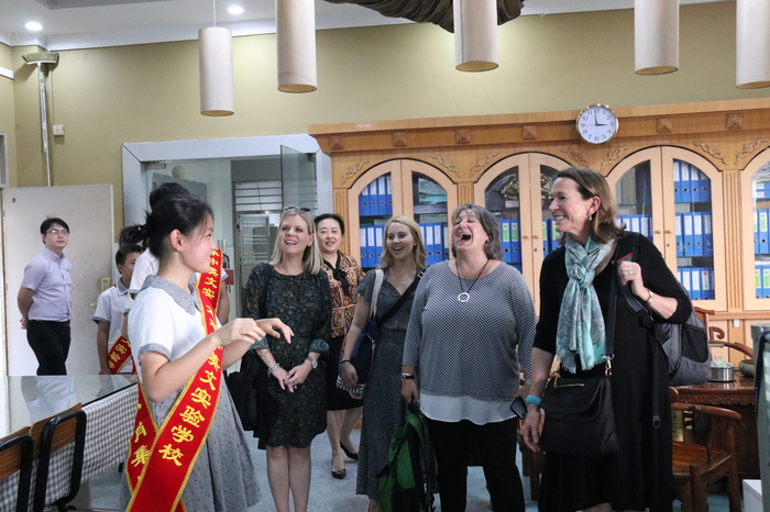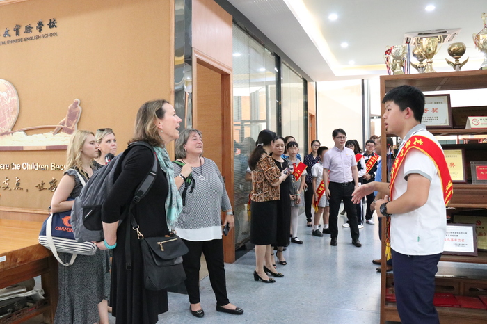 參觀訪問代表團(tuán)首先實(shí)地考察了我校高中美術(shù)專業(yè)班、創(chuàng)客實(shí)踐工作室、社會(huì)資源中心、行政服務(wù)中心、圖書資源中心、小班化精品課堂等場室及學(xué)生學(xué)習(xí)情況,在集團(tuán)及學(xué)校領(lǐng)導(dǎo)的陪同下,小學(xué)、初中、高中學(xué)生代表全程用英語對美國客人進(jìn)行了介紹。來賓對我校一流的資源配置、學(xué)生良好的學(xué)習(xí)狀態(tài)表示贊賞,紛紛拍照留念。