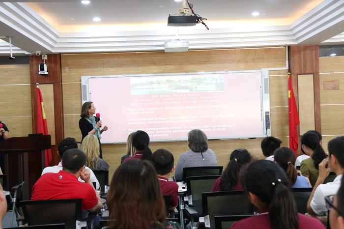 接著在教師培訓(xùn)室舉行了“美國精英高中學(xué)校見面會(huì)”,集團(tuán)下屬公明中英文及我校家長、學(xué)生代表近80人參會(huì)。見面會(huì)上,美國三所學(xué)校代表致辭并介紹了各自的學(xué)校,集團(tuán)國際交流中心宋騰主任介紹了遠(yuǎn)恒佳國際教育中心業(yè)務(wù)開展情況,參會(huì)家長、學(xué)生在會(huì)上進(jìn)行了現(xiàn)場交流互動(dòng)。見面會(huì)氣氛融洽,文化交流順暢。