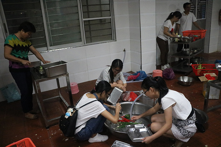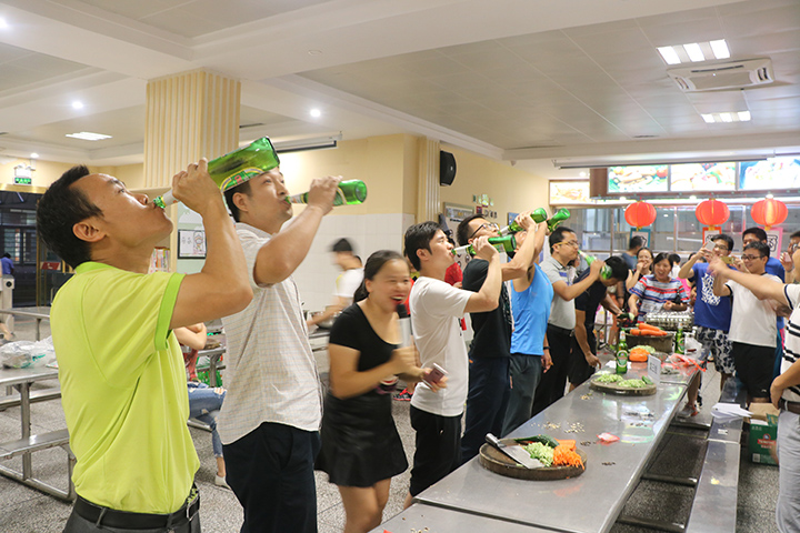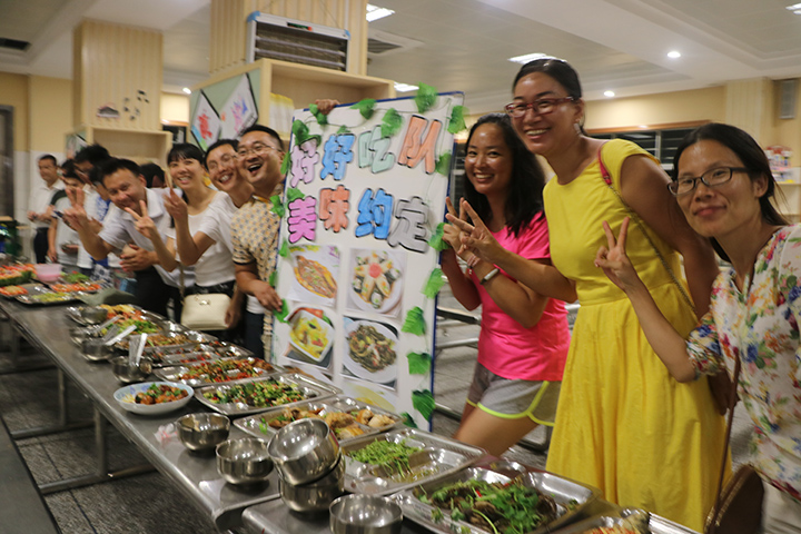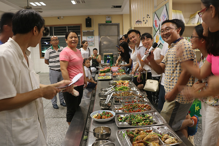 教師廚藝比賽是公明中英文學(xué)校建設(shè)幸福校園,活躍教職工業(yè)余生活的一項(xiàng)舉措。活動(dòng)將全校教師分成六個(gè)組,每組給予一定的經(jīng)費(fèi),食材自行購(gòu)買(mǎi),要求每組各出16個(gè)菜,其中4個(gè)菜參加評(píng)分,其余的菜參與交流?;顒?dòng)當(dāng)天正好是運(yùn)動(dòng)會(huì),老師們得以有時(shí)間到市場(chǎng)精選食材。下午5點(diǎn)鐘,運(yùn)動(dòng)會(huì)結(jié)束,學(xué)生全部離校后,老師們按照事先的分工有序的忙碌起來(lái)。洗菜、切菜、雕花、拼盤(pán),平時(shí)溫文爾雅的老師現(xiàn)在儼然一個(gè)個(gè)大廚,鍋鏟飛舞、菜色琳瑯、滿室顠香,各組選派的廚師們輪番上陣,一人一個(gè)自己的拿手好菜,“我心飛翔”、“青龍臥雪”,不但看得人垂涎欲滴,連名字都起得這么有意境。在另一個(gè)賽場(chǎng),進(jìn)行的是”刀工、嗑西瓜子、喝啤酒和蒙眼喂甜筒比賽,比賽規(guī)定,四個(gè)項(xiàng)目積分最后的一個(gè)組,全組組員要喝苦瓜汁。為了不讓自己的組員出丑,場(chǎng)上隊(duì)員盡力表現(xiàn),場(chǎng)下組員吶喊助威,滿臉的奶酪、對(duì)瓶吹啤酒的表情,嗨翻了全場(chǎng)。