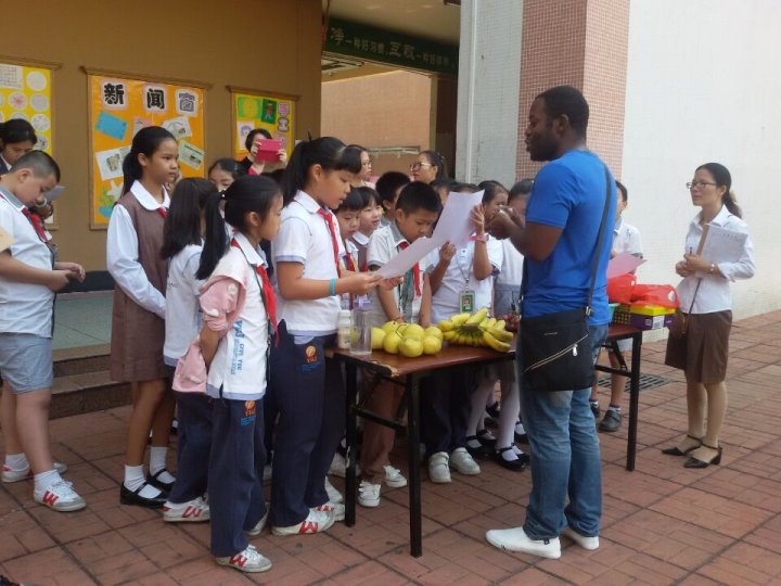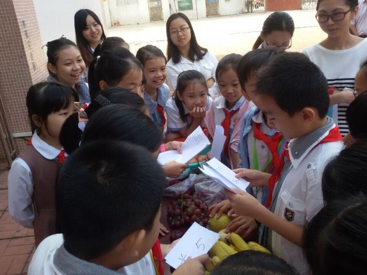 2016年10月10日上午,外教Antony在教學(xué)樓廣場(chǎng)上布置水果攤位,組織五A班學(xué)生買(mǎi)賣(mài)水果,讓孩子們?cè)谏钋榫爸羞\(yùn)用英語(yǔ)口語(yǔ)。前來(lái)觀摩的老師們興致勃勃地融入到孩子們的活動(dòng)中,主動(dòng)與孩子們用英文對(duì)話(huà)。雖然孩子們?nèi)⒄Z(yǔ)交流有些吃力,但他們還是非常努力地用英文完成了水果的售賣(mài)與購(gòu)買(mǎi)的交際活動(dòng),整個(gè)過(guò)程開(kāi)心無(wú)比。(文、圖/莫三愛(ài))