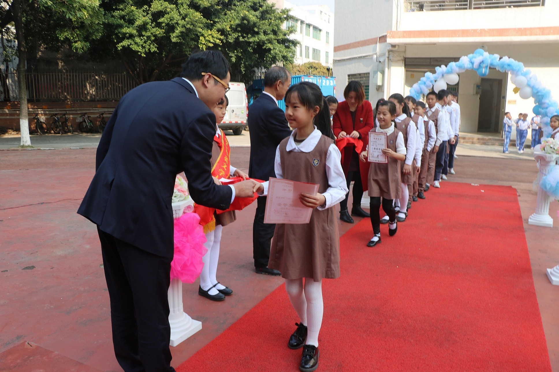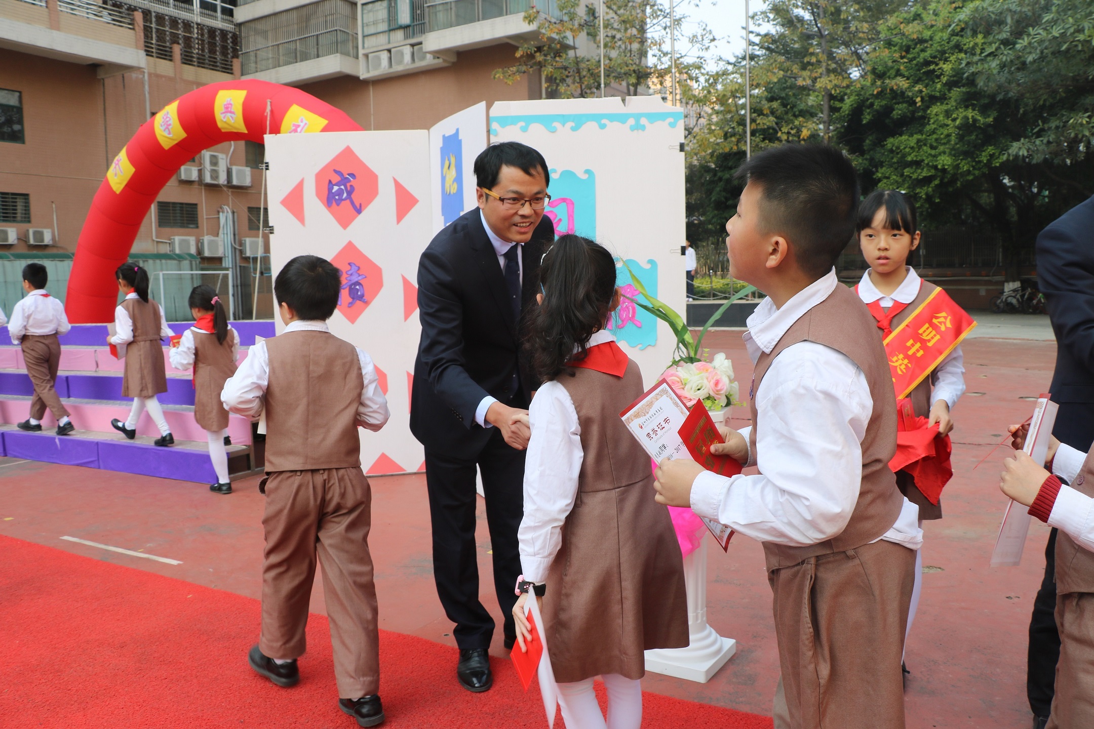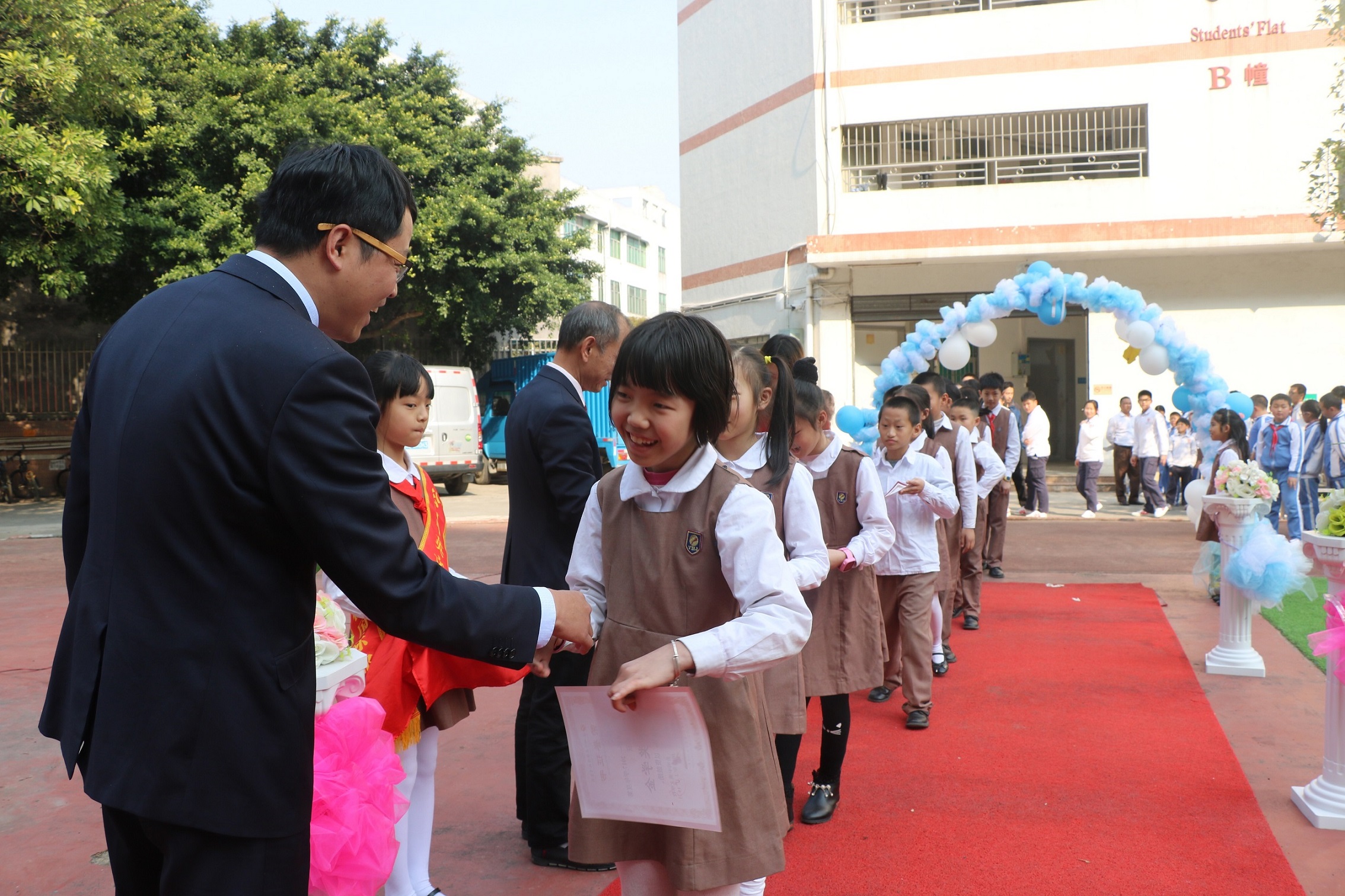 公明中英文學校學生走上紅地毯,與校長握手。