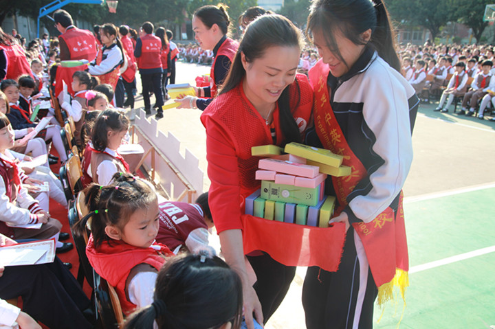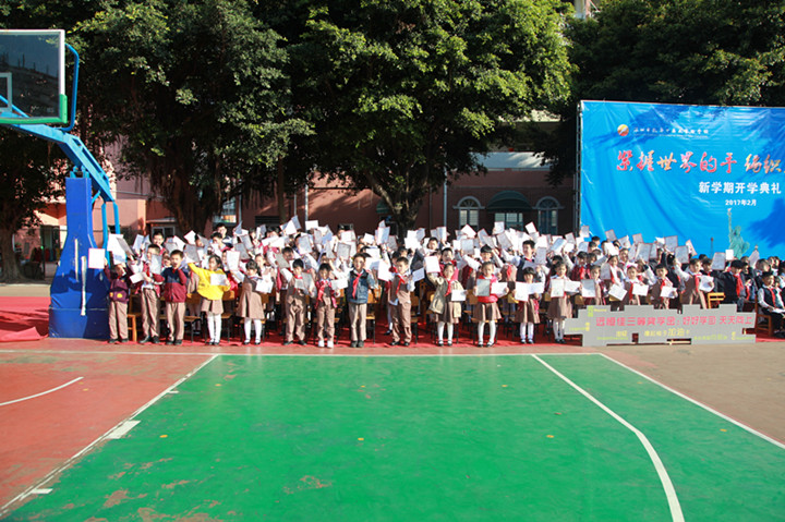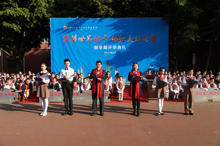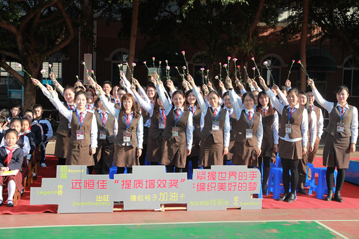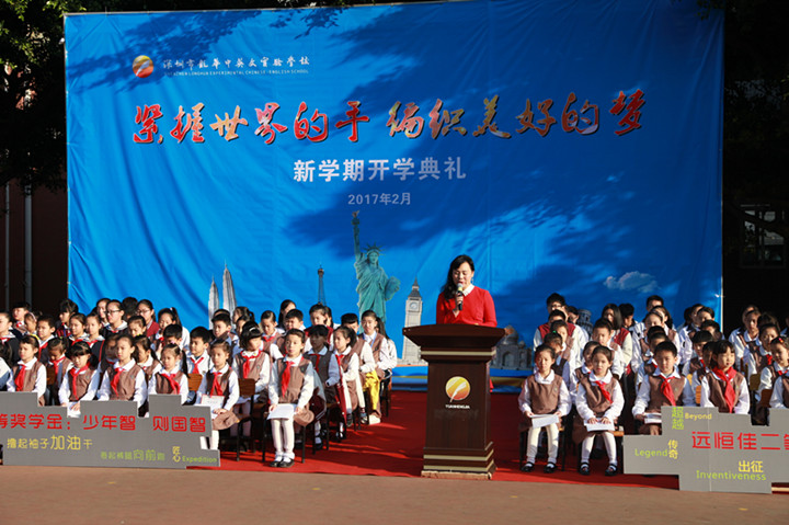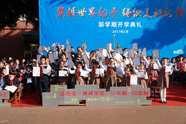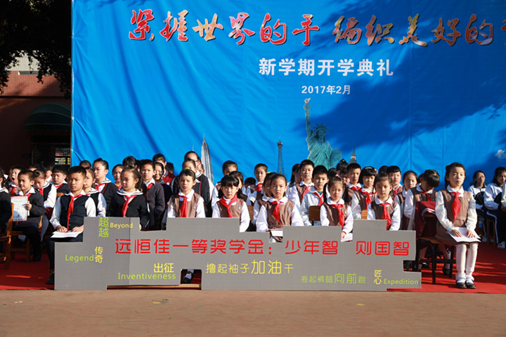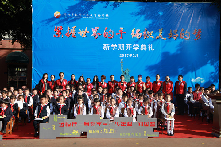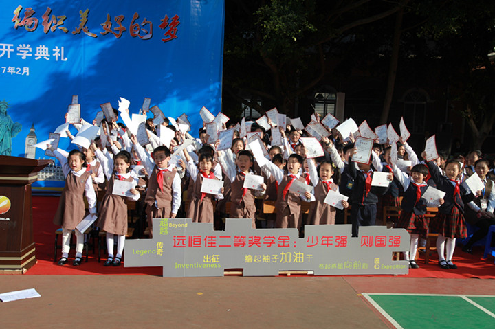 2017年02月15日,深圳市龍華中英文實(shí)驗(yàn)學(xué)校在運(yùn)動(dòng)場(chǎng)舉行新學(xué)期開學(xué)典禮。今春的開學(xué)典禮呈現(xiàn)出新設(shè)計(jì)、新流程、新風(fēng)尚的特點(diǎn)。活動(dòng)最引人注目的是坐在主席臺(tái)上的四個(gè)方陣,分別是獲得“遠(yuǎn)恒佳獎(jiǎng)學(xué)金”的三個(gè)學(xué)生方陣以及獲得學(xué)?!疤豳|(zhì)增效獎(jiǎng)”的教師方陣。其中,共有182名學(xué)生獲“遠(yuǎn)恒佳獎(jiǎng)學(xué)金”,發(fā)放獎(jiǎng)金三萬零五百;共有74名教職工獲學(xué)?!疤豳|(zhì)增效獎(jiǎng)”,發(fā)放獎(jiǎng)金十萬元。家委會(huì)成員和家長(zhǎng)代表為獲獎(jiǎng)師生頒發(fā)紀(jì)念品和鮮花,獲獎(jiǎng)師生被請(qǐng)到主席臺(tái)就坐,成為開學(xué)典禮的主角,充分體現(xiàn)了學(xué)校開放辦學(xué)、尊重知識(shí)、尊重人才、表彰先進(jìn)的教育思想。