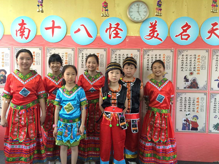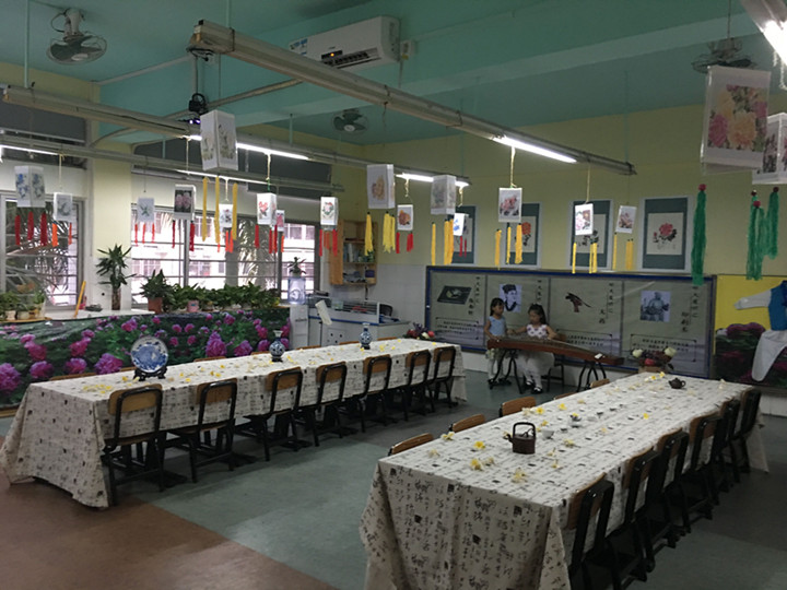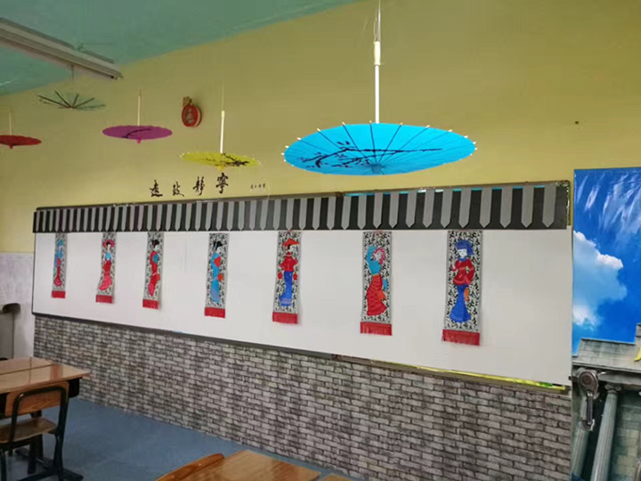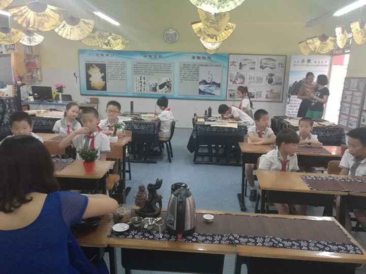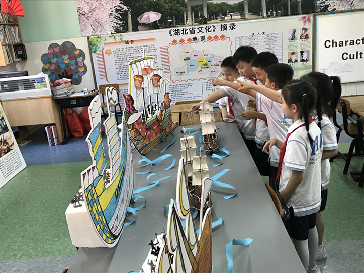 各班級的地域文化創(chuàng)設各具特色。3D班以“安徽十大名茶”為主題,以黃梅戲人物手工縮影畫為特色,輔以現(xiàn)場沏茶、彈古箏將安徽文化演繹得古色古香;1B班匠心獨運,教室內的武漢大學、黃鶴樓、湖北省文化等造型大氣磅礴,賦予教育意義,課桌上整齊擺放的各種古代帆船、戰(zhàn)船重現(xiàn)了赤壁古戰(zhàn)場昔日的輝煌;5A班栩栩如生的“云南十八怪”圖片、惟妙惟肖的各種民族掛飾、服裝、服飾再現(xiàn)了民族風情,七彩的懸掛整齊的風鈴,微風徐來,那悠悠的脆脆的銅鈴聲無不引起我們對云南昔日商貿(mào)、文化繁榮的遐想……