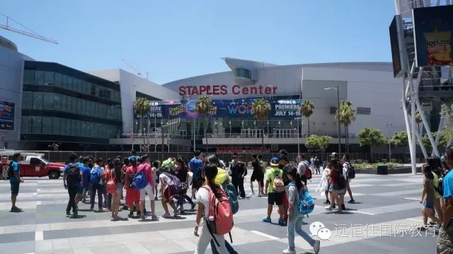 隨后,同學們來到了著名的斯臺普斯球館,這里,是著名的NBA球隊洛杉磯湖人以及洛杉磯快船隊的主場,男生們迫不及待地在雕塑面前,與NBA名宿魔術(shù)師約翰遜,天溝賈巴爾等的雕像合影。