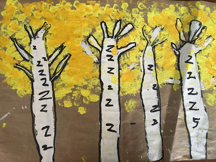 圖二是來自創(chuàng)意美術(shù)C班舒詣然的作品《會(huì)唱歌的樹》,你是否感覺到了呢?