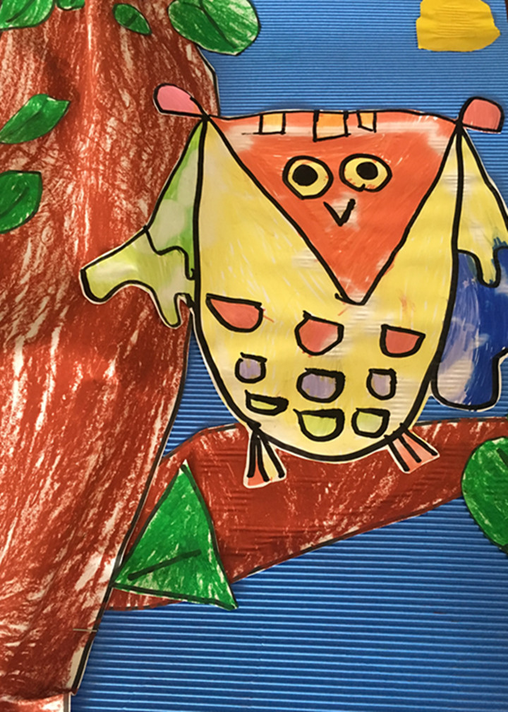 圖四是來自創(chuàng)意美術(shù)A班葉辰的作品《樹上的貓頭鷹》,很贊的感覺,有木有~