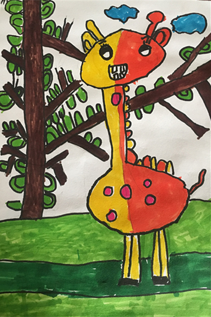 圖五是來自創(chuàng)意美術(shù)C班杜俊豪的作品《快樂的長頸鹿》,讓我們感受到了小朋友內(nèi)心對(duì)動(dòng)物的喜愛。
