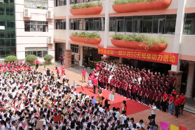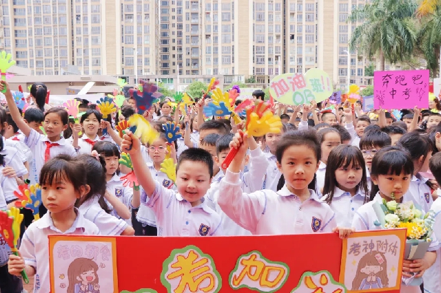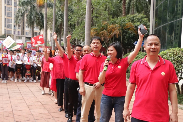 2021年5月6日上午,第二節(jié)課剛一結(jié)束,公明中英文學(xué)校全體師生、家長代表迅速齊聚小廣場。一瞬間,鑼鼓聲、吶喊聲、歌聲、掌聲震耳欲聾;應(yīng)援板、加油橫幅、張張笑臉映入眼簾,一年一度的中考倒計時50天“喊樓”活動如期而至!