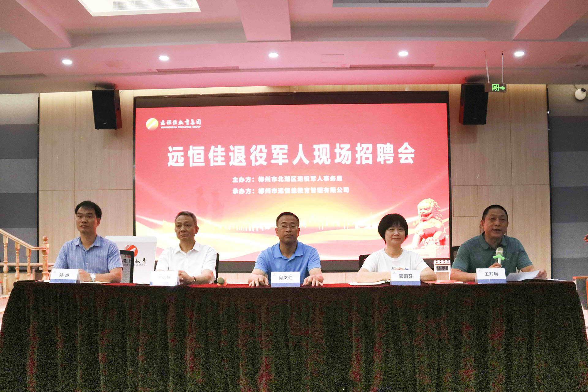 北湖區(qū)退役軍人事務(wù)局副局長肖文匯(左三),遠恒佳教育集團黨總支書記、董事長宋遠標(左二),集團董事、副總裁麥麗芬(右二),郴州遠恒佳學校副校長鄧盛(左一)參加招聘會,遠恒佳郴州公司總經(jīng)理王開利(右一)主持招聘會。